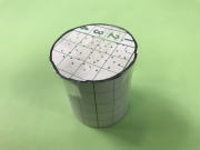 | ② 10cm×15cmの厚紙を、丸めて筒にします。 ①で作ったプラスティックの三角の筒が、中に収まる大きさにします。 |