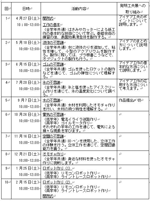 | 回 | 日時 | 低学年(9:00-10:15) | 高学年(10:30-12:00) | 発明工夫展への取り組み |
